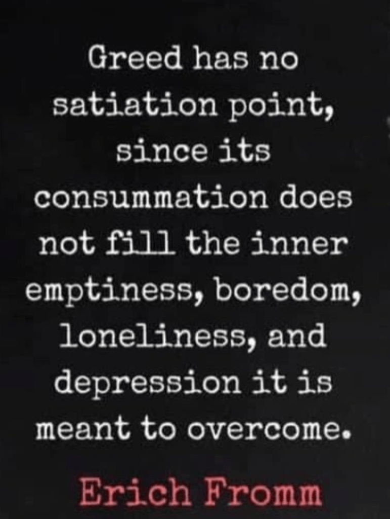 L’avidité n’est jamais rassasiée car toute tentative de «bourrage» ne comble ni le vide intérieur, ni l’ennui, ni la solitude et ni la dépression qu’elle est censée surmonter. – Erich Fromm.