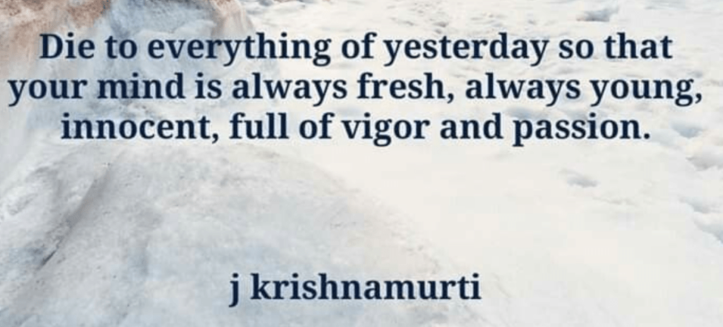 Ou dit autrement, à la Krishnamurti : Meurt à tout ce qui était d’hier pour que ton esprit puisse toujours demeurer frais, toujours jeune et innocent, plein de vigueur et de passion.