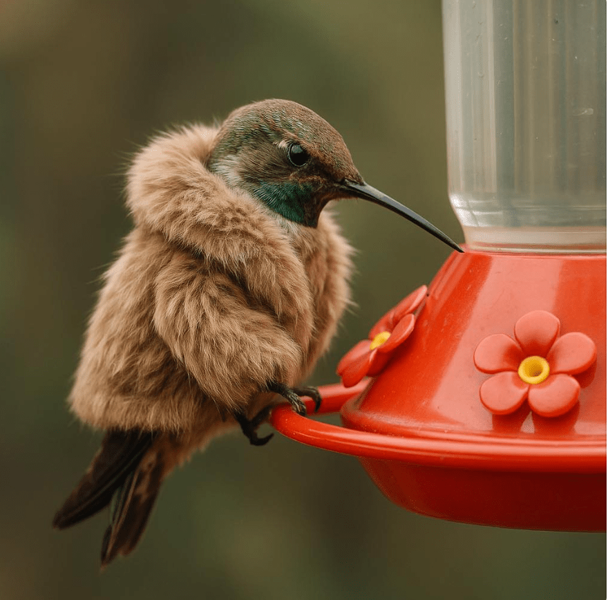 Wow ! C’est le plain temps. J’ai vu mon premier colibri ce matin. Mai cette année, c’est comme pour nous, il est un peu découragé. Ou est-ce une elle ? Poulet pas dire.