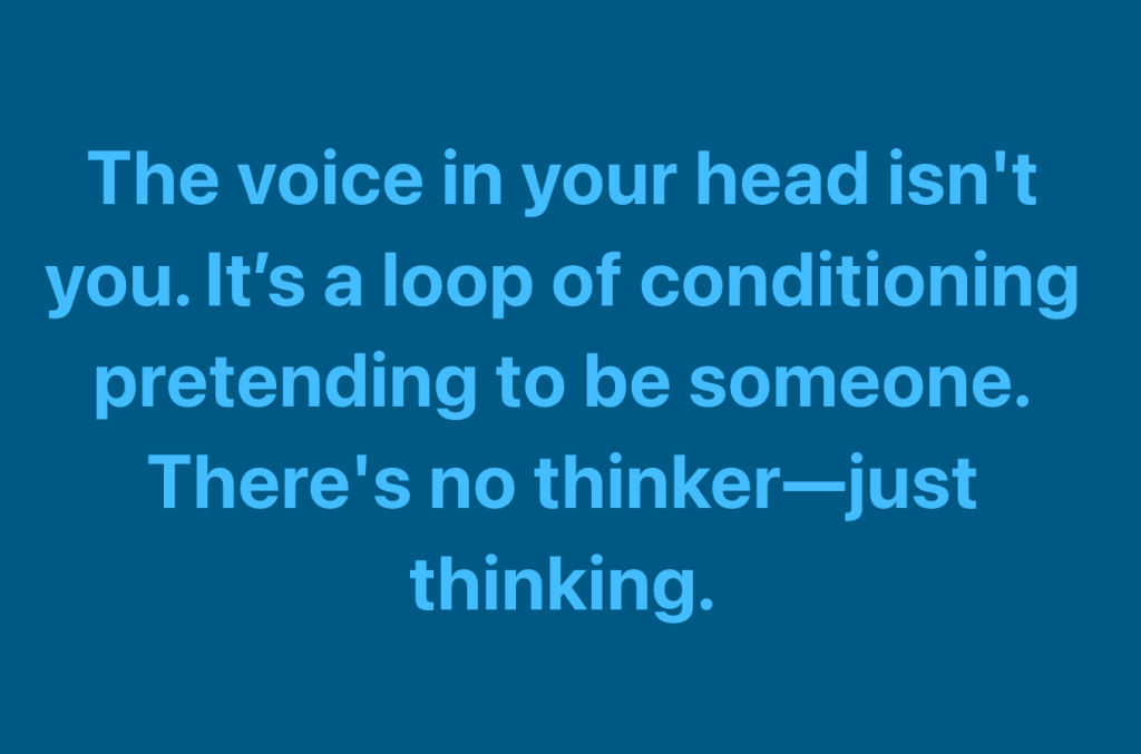 La voix dans ta tête n’est toi. C’est un conditionnement qui roule en boucle prétendant être quelqu’un.. Il n’y a pas de penseur, que pensées. – source inconnue mais ça aurait être vous et moi right ?