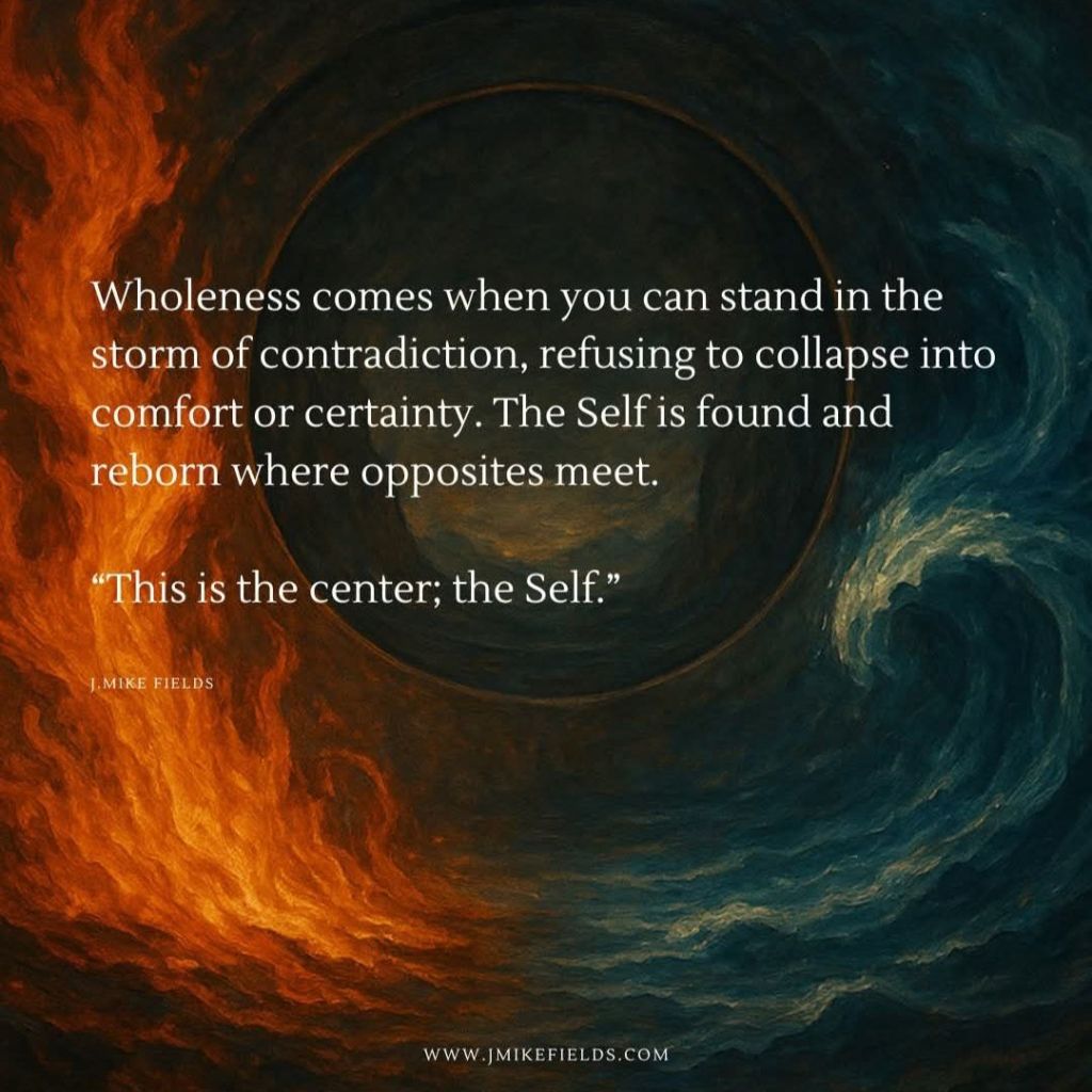 La totalité et l’intégrité arrivent lorsque vous pouvez vous tenir droit.e au coeur d’une tempête de contradiction, en refusant de vous effondrer autant dans le confort que dans la certitude. Le Soi se retrouve alors et renait lorsque les opposés se rencontrent. Ceci est le centre, le Soi. – J. Mike Fields