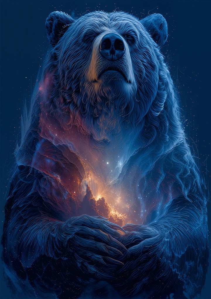 ___ Il était une fois un ours si vieux que même les montagnes ne se souvenaient plus du temps qui l’avait précédé. On l’appelait Orun, ce qui signifie « la flamme silencieuse ». Sa fourrure scintillait des couleurs du cosmos : un indigo profond, strié de feu et de lumière, comme s’il portait un fragment de l’univers sur son dos.