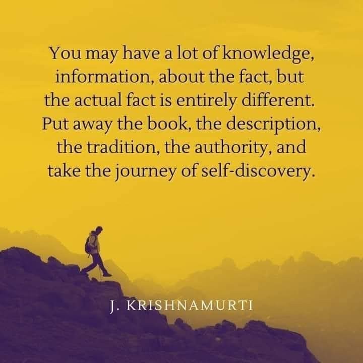 Comme le dit si bien ici Krishnmurti – avec des mots of course – on peut posséder de nombreuses connaissances et informations au sujet des faits, mais les faits réels sont entièrement différents. Mettez les livres de côté, les descriptions, les traditions et l’autorité, et engagez-vous sur le chemin de la connaissance de soi.