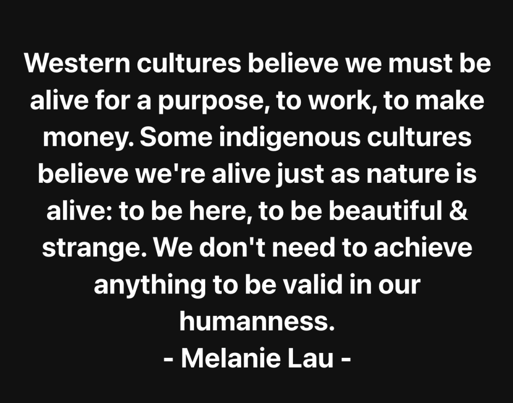 La culture occidentale nous fait croire que nous sommes vivant.e.s dans un but précis, pour travailler, pour produire, pour faire de l’argent. Certaines cultures autochtones avancent plutôt que nous sommes vivant.e.s simplement telle qu’est vivante la nature : que pour être ici, pour être beau et belle et un peu étrange. Nous n’avons pas besoin d’accomplir quoi que ce soit pour mériter notre humanité.