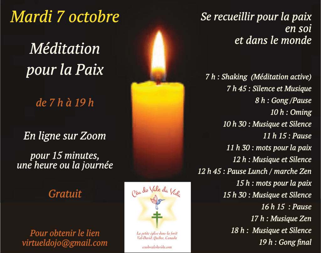 Parce que nous avons ce luxe, ici, dans cette partie du monde, aujourd’hui, nous serons quelques personnes personne qui méditerons, en silence, en ligne, ensemble, face à l’impuissance de solutions autres devant le chaos et la dualité exacerbée en extrêmes polarisés assassins.